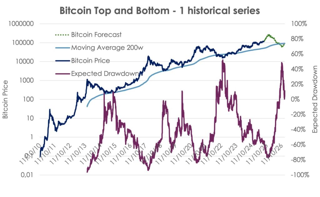 در حالی که همه در تلاش برای پیشبینی حداکثر قیمت بیت کوین در این چرخه هستند، که احتمالاً در اواخر اکتبر ۲۰۲۵ به پایان میرسد، واحد تحقیقات Diaman Partners سعی کرده است تا حداقل قیمت بیت کوین در سال ۲۰۲۶ را، در صورت وقوع رکود بازار در ماههای آینده، تخمین بزند. بسیاری از کارشناسان حدس میزنند که مرحله چرخهای بیت کوین به پایان رسیده و اکنون وارد فاز جدید و «پختهتری» از رشد باثبات شدهایم.
